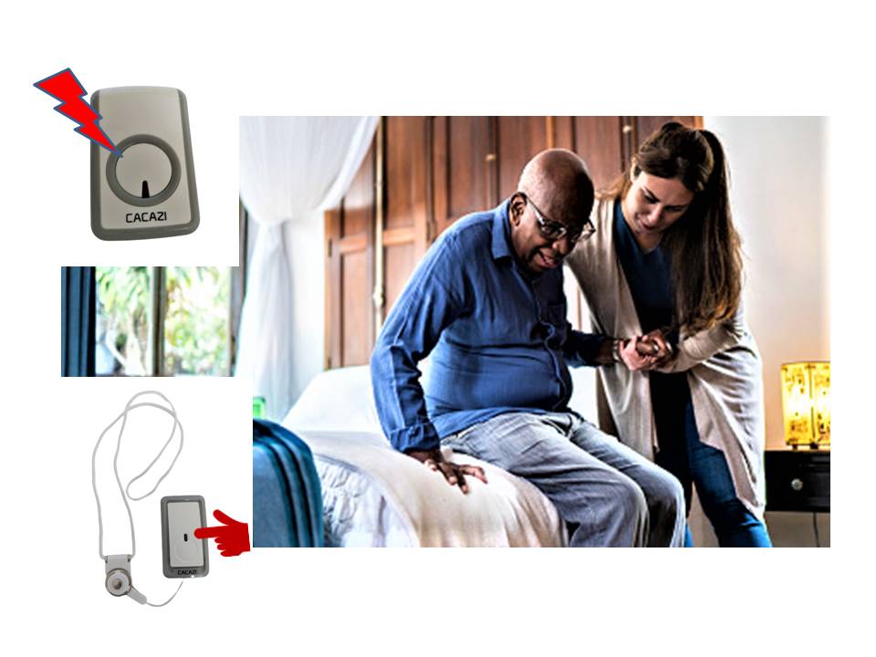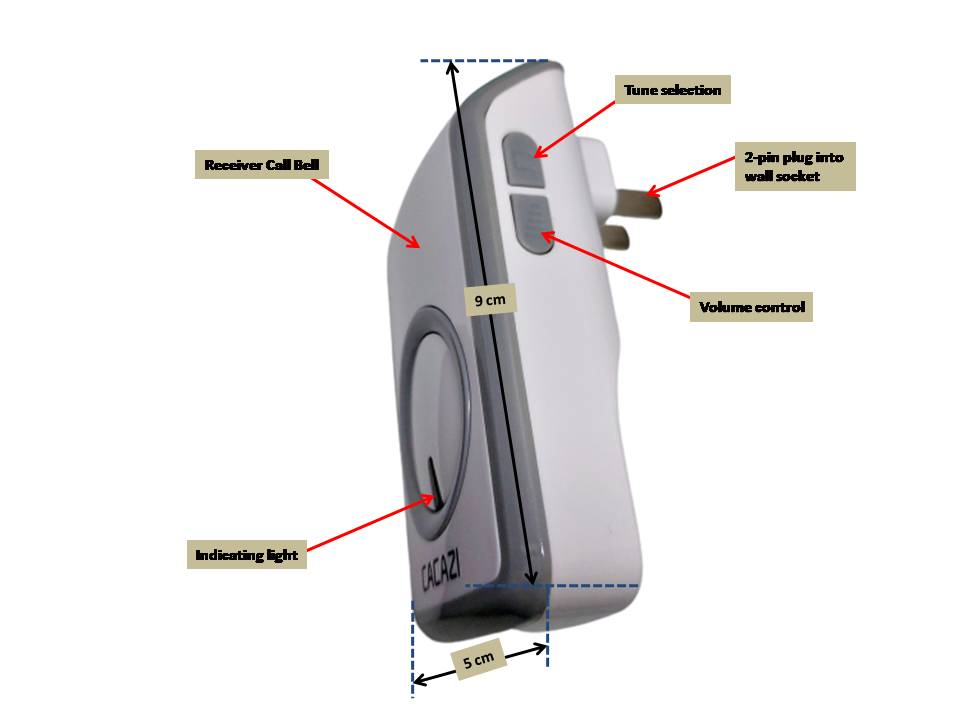 -User simply presses the Call Button when in need of attention to activate the Receiver Call Bell. The Receiver Call Bell is plugged into wall socket in other parts of the house where the caregiver is usually positioned such as another room or in kitchen.